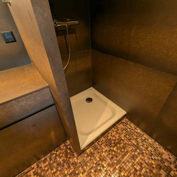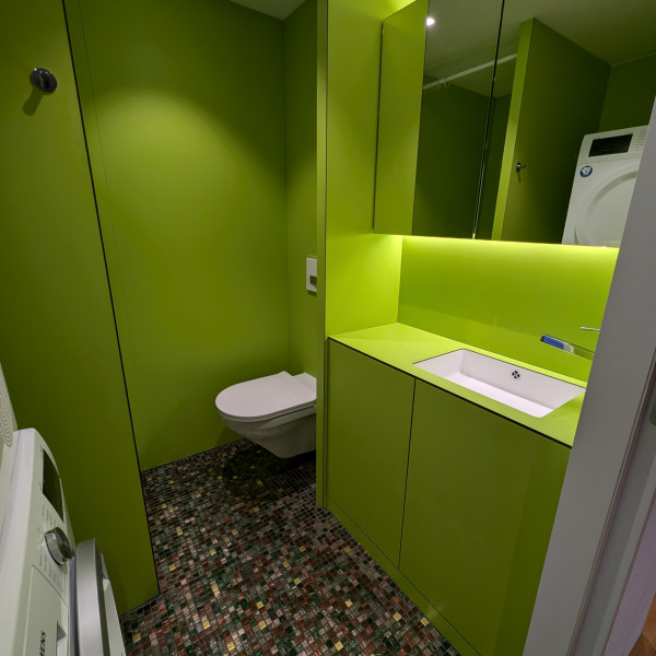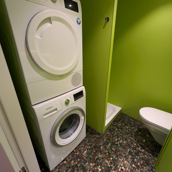 Im vierten Stock gibt es den Eingangsbereich, einen offenen Raum, das Schlafzimmer, das Badezimmer mit Dusche sowie die separate Dusche mit Toilette und einen eigenen Waschturm (Waschmaschine/Tumbler).